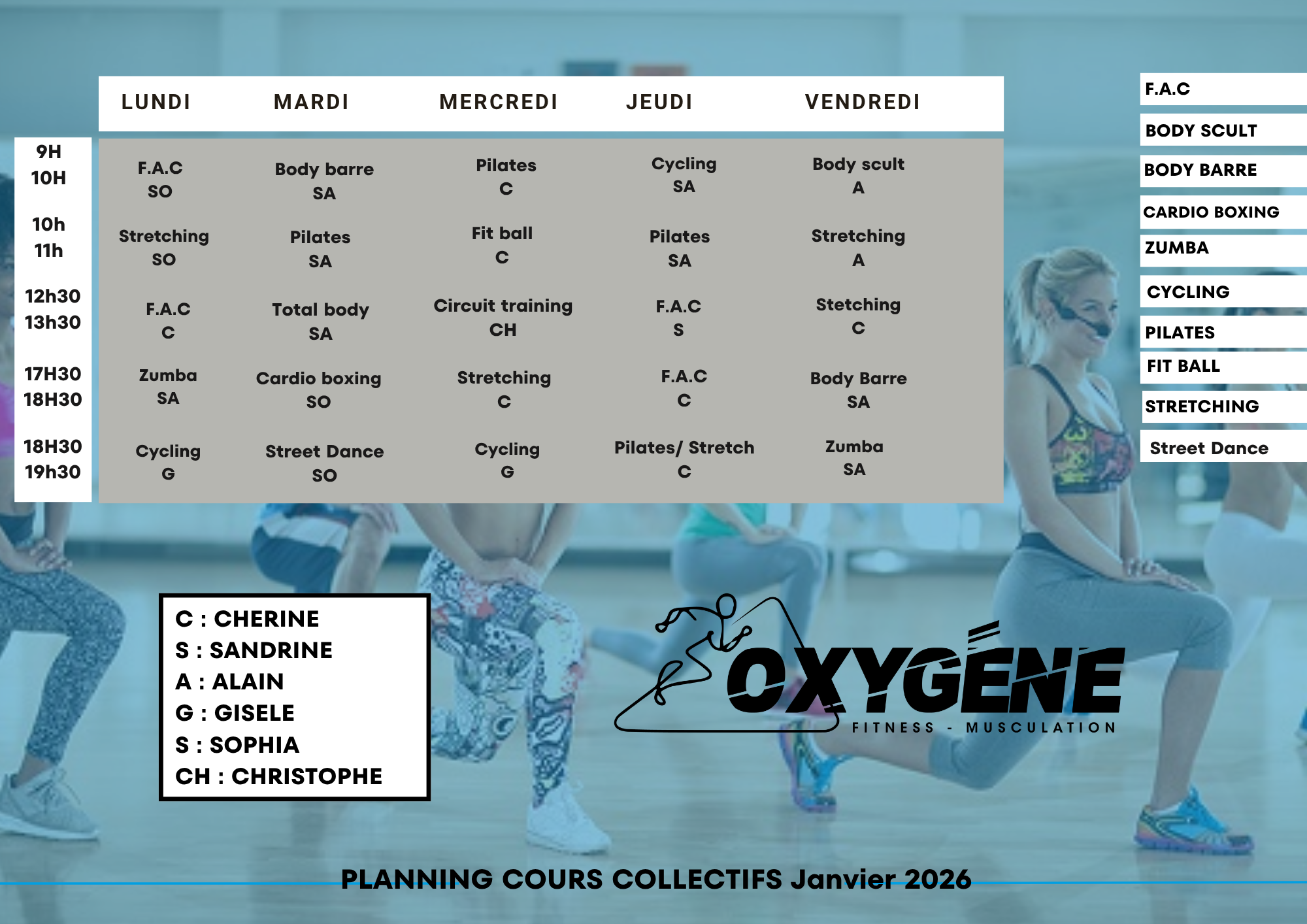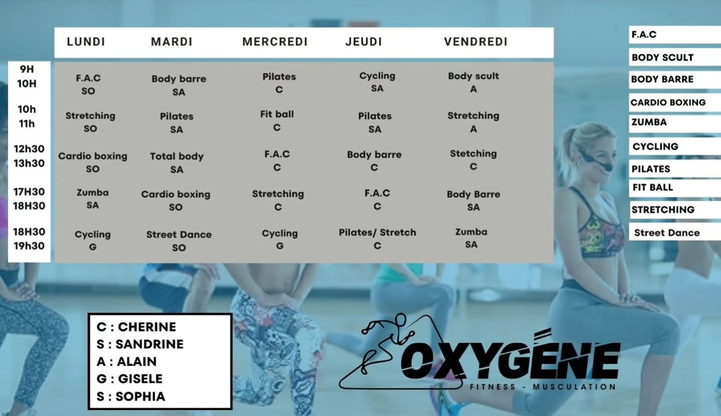 Les cours collectifs d’Oxygene Club regroupent plusieurs formats d’activité et diférentes méthodes d’exercices. Nos profs sont tous des professionnels dans leurs domaines respectifs. Souriants et toujours à l’écoute, ils sauront vous accompagner durant vos exercices.
